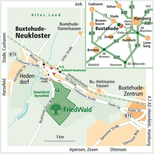 Mit der Bahn: Von Hamburg Hauptbahnhof mit der S3 bis Neukloster fahren. Vom Bahnhof Neukloster aus erreichen Sie den FriedWald nach ca. 600 Meter Fußweg. Hierzu nach links über die Gleise in die "Jorker Straße“ zur B73 hochgehen (200 Meter). Weiter nach links der B73 (Cuxhavener Straße) bis zum Kilometer-Stein 18,4 folgen (150 Meter), dort rechts in den "Neukloster-Forst-Weg" einbiegen. Nach weiteren 350 Metern erreichen Sie linker Hand den FriedWald-Parkplatz.
